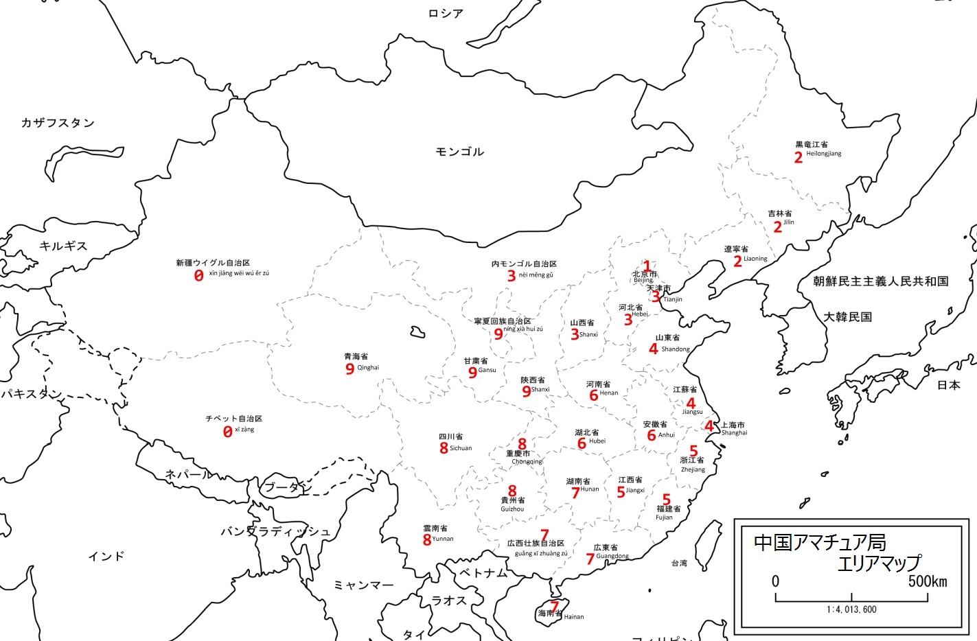 中国のアマチュア局のエリアマップ。クリックで拡大します