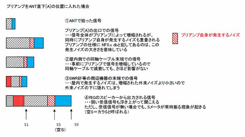 プリアンプをトップ(ANT直下)に入れた場合と、ボトム(RIG直後)に入れた場合とでは、